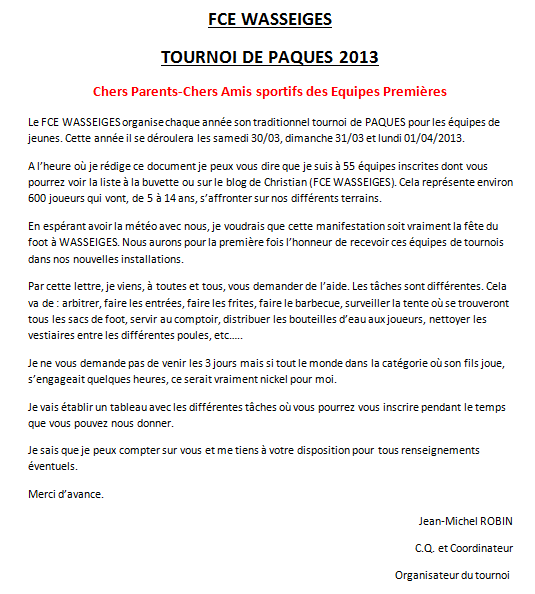 FCE WASSEIGES TOURNOI DE PÂQUES 2013.